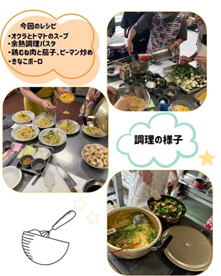 講話の後はグループごとで、余熱調理パスタ・オクラとトマトのスープ・鶏むね肉と茄子、ピーマン炒め・きなこボーロを作りました。