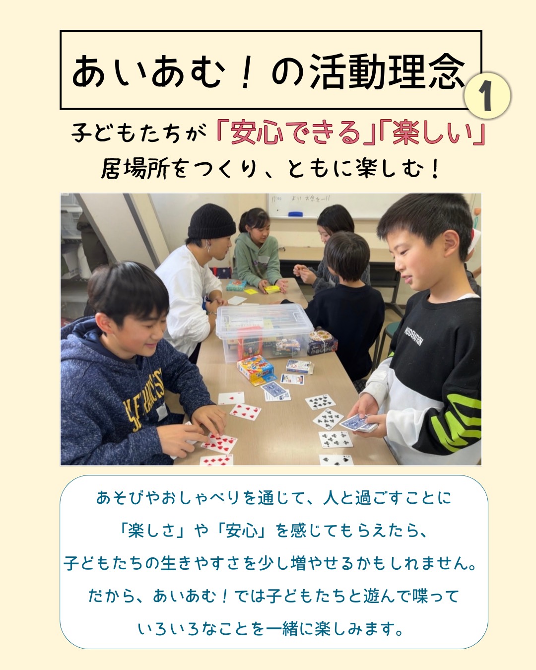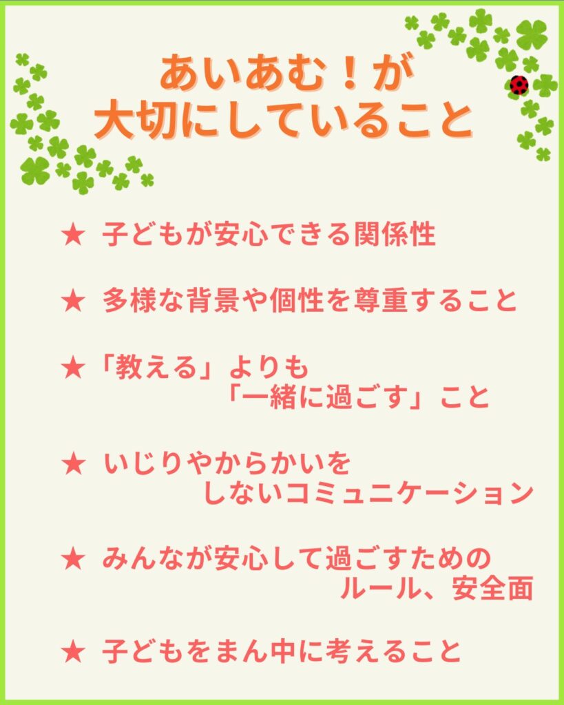 「ちょっと話を聞いてほしい」と思える関係性と、「一緒に遊べるお兄さん・お姉さん」のような存在。その両方があることが、あいあむ!の特徴です。 - 「安心」と「楽しい」を土台とした3つの想い