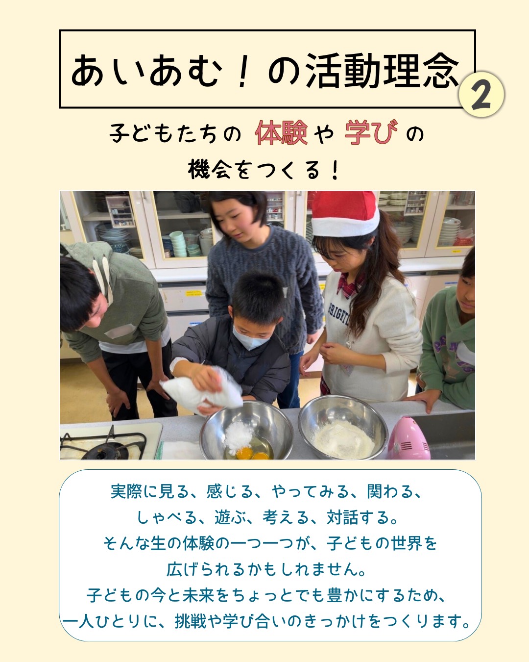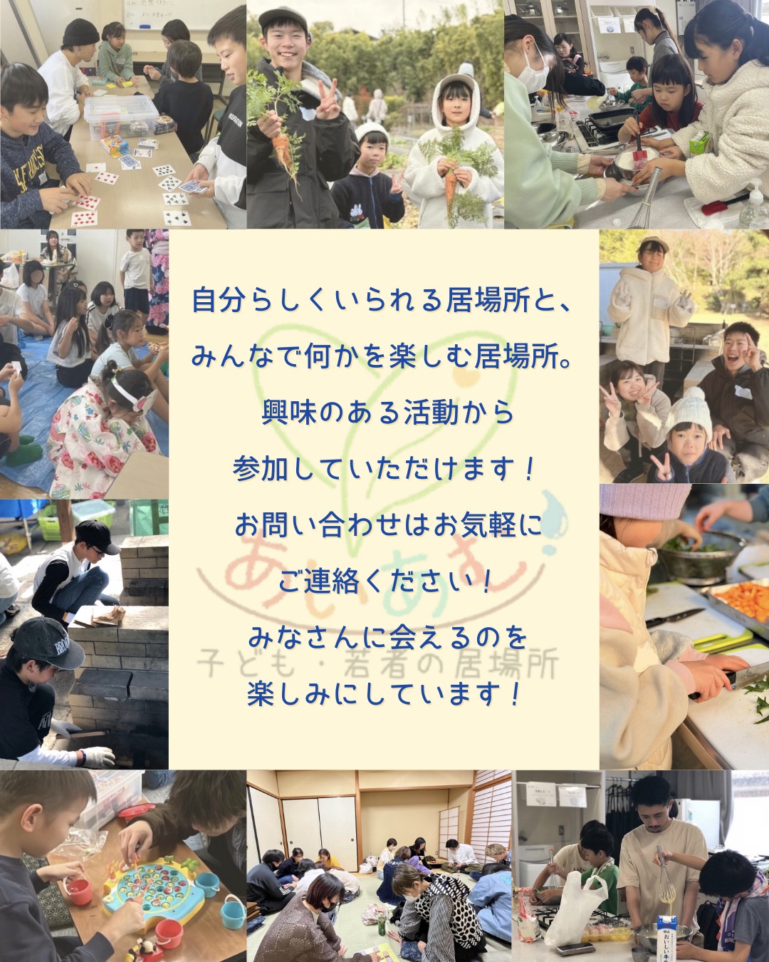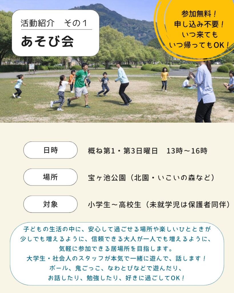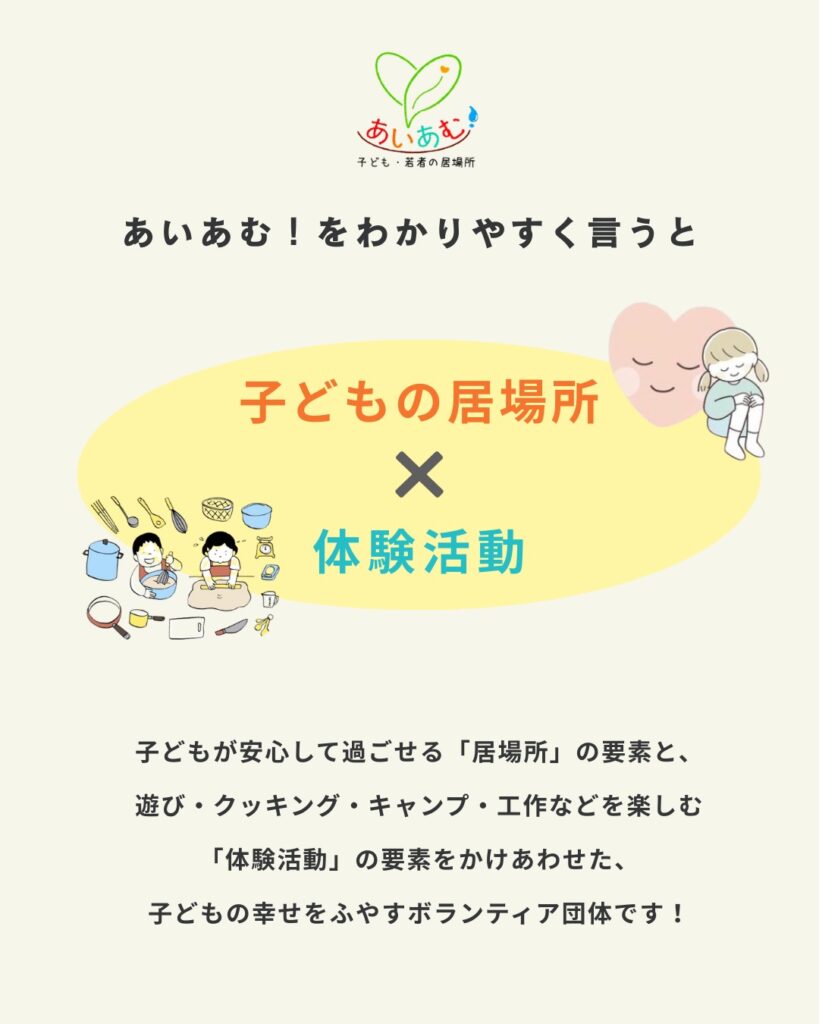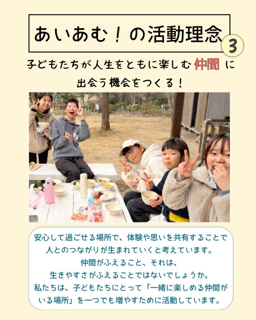 「子ども・若者の『今』をより幸せにするために、安心して楽しく過ごせる場所、あたたかい人とのつながりを感じられる場所をつくりたいな」