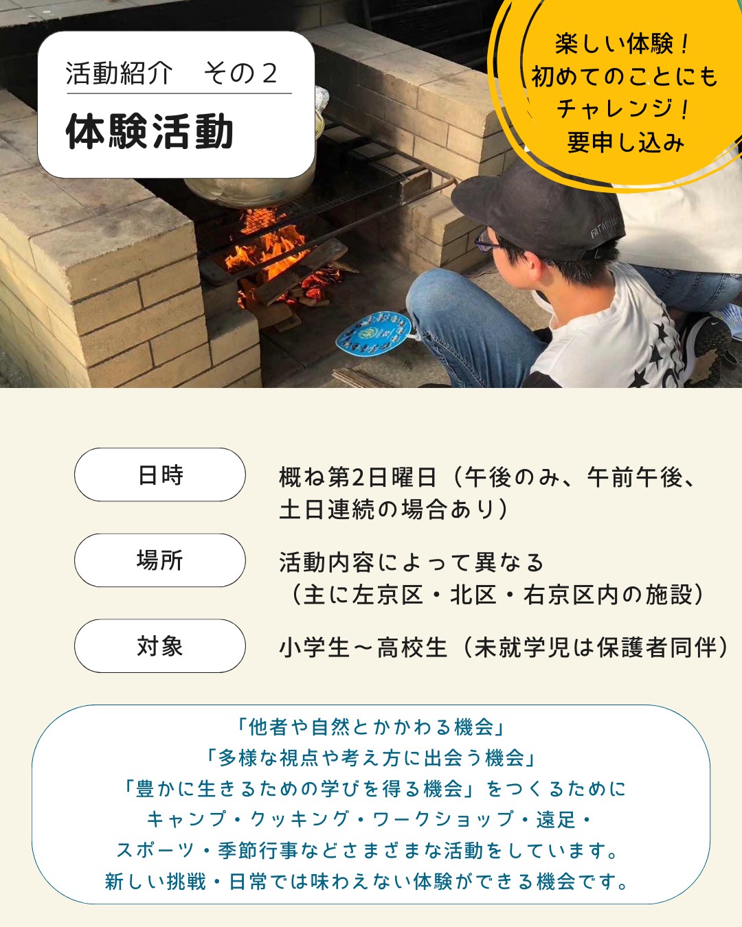 キャンプやクッキング、遠足、スポーツ、ワークショップなど、毎回ちょっとしたワクワクが詰まった活動です。