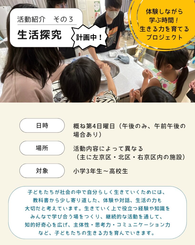 少しだけ日常から離れて、「これから生きていく力」について考えたり、体験したりする時間です。