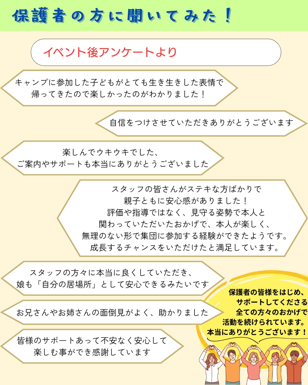 保護者の方からも、「とても楽しそうに帰ってきた」「安心して送り出せる場所です」といった声が届いています。 - 「社会とつながるって楽しい」と思えるように